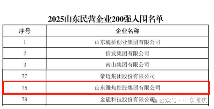 近日,山東省工商聯(lián)、省發(fā)展改革委、省科技廳、省人力資源社會保障廳、省農(nóng)業(yè)農(nóng)村廳、省商務廳、省稅務局、省市場監(jiān)管局、省總商會共同組織開展了2025山東民營企業(yè)百強系列榜單發(fā)布活動。山東濰焦控股集團有限公司榮登“2025山東民營企業(yè)200強”第78位。